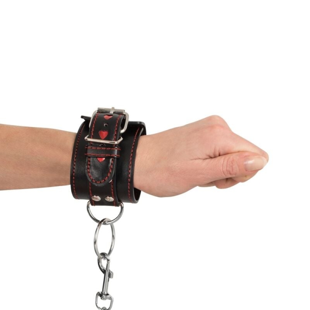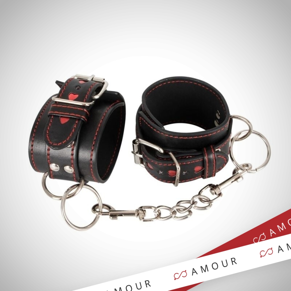 Juodi antrankiai, pasiūti iš odą imituojančios medžiagos, krašteliai tvirtai apsiūti, dirželiai dekoruoti raudonomis širdelėmis, suteikiančiomis romantišką nuotaiką. Tinkami smulkiems riešams, susegami sagtimis, karabinais tarp jų prijungta grandinė, kurią galėsite nusegti. Puikus aksesuaras porelėms, trokštančioms paįvairinti intymius žaidimus.
