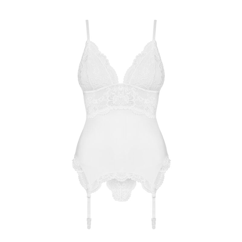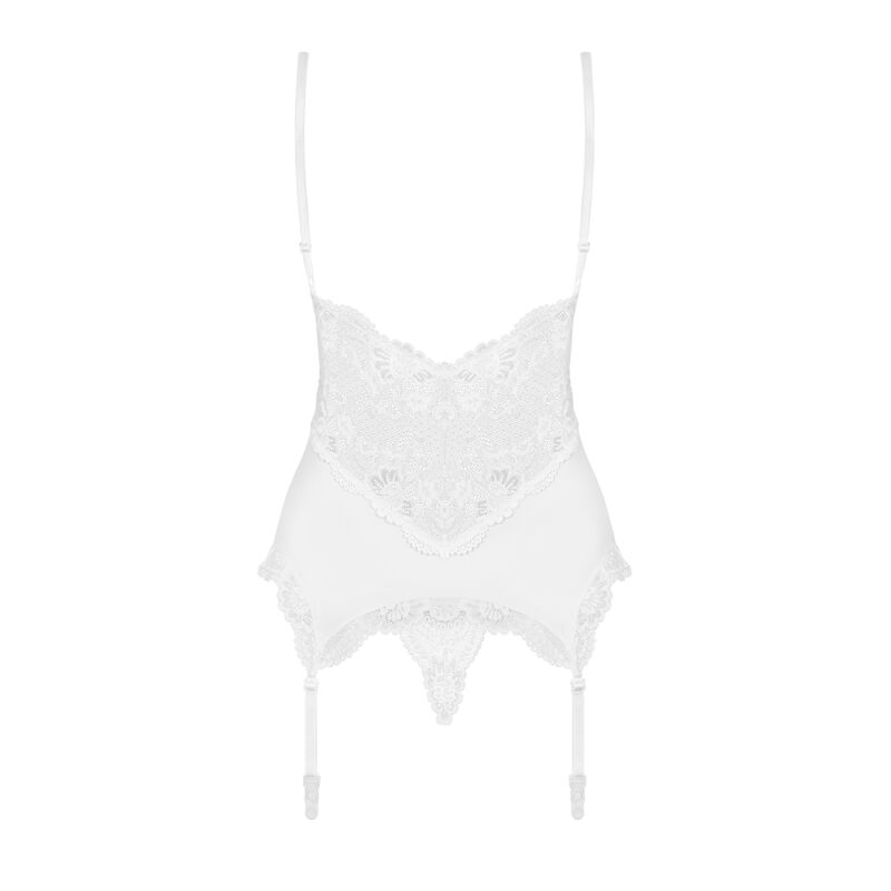 Kvapą gniaužiantis korsetas su akį traukiančiais nėriniais. V formos iškirptė, petnešėlės ir dirželiai kojinėms prisegti reguliuojamo ilgio. Pasiūtas iš tamprios medžiagos, kuri maloniai priglunda prie kūno. Jausitės seksuali ir savimi pasitikinti, o tai užtikrins, jog vakaras bus itin karštas.