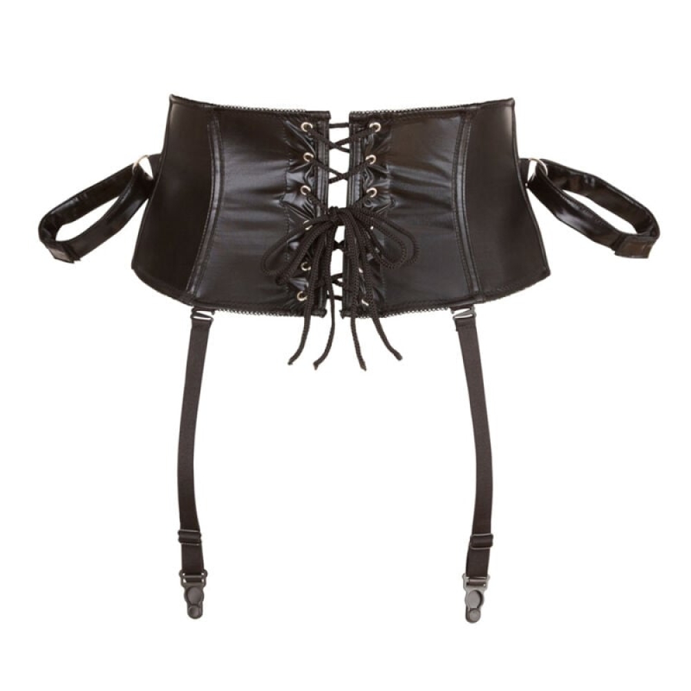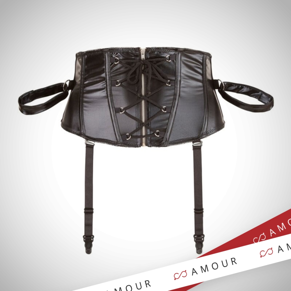 - juosmens korsetas, priekyje turintis užtrauktuką, taip pat yra suvarstomas tiek priekyje, tiek gale. Pasiūtas iš blizgios medžiagos, akimirksniu atkreipiančios dėmesį. Prie jo D formos žiedeliais pritvirtintos kilpos rankoms, taip jos būna prikaustytos prie Jūsų šonų. 4 reguliuojamo dydžio juostelės skirtos prisegti kojines. Juostelės gali būti lengvai nuimamos. Medžiaga: 92% poliesteris, 8% elastanas;