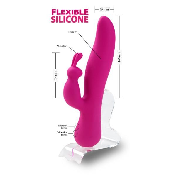 Aukštos kokybės vibratorius, pagamintas iš silikono, jo paviršius švelnus ir glotnus, maloniai priglunda prie kūno. Šis žaisliukas suteiks Jums tokį malonumą, apie kurį net nebuvote pagalvojusi! Pagrindas šiek tiek banguotos formos, galvutė lenkta, kad kuo lengviau pasiektų G tašką, o atsikišusios kiškučio ausytės atsiduria ant klitoriaus ir veda jį iš proto! Vibratorius ne tik vibruoja, bet ir atlieka rotaciją, todėl Jūsų intymūs poreikiai bus tikrai patenkinti. Intuityvaus dizaino, intensyvių greičių, atsparus vandeniui žaisliukas, kuris paliks neišdildomą įspūdį.